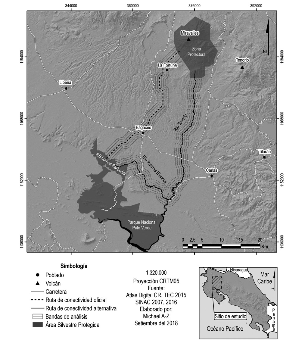 Este estudio involucró las siguientes áreas silvestres protegidas de la cuenca del río Bebedero: la Reserva Biológica Lomas Barbudal y la Zona Protectora Miravalles. Estas áreas se ubican al noroeste de Costa Rica, entre las coordenadas geográficas 10°25’32’’-10°47’58’’N & 85°4’37’’-85°22’55’’W. Desde el año 2007 existe entre ambas áreas protegidas la ruta de conectividad oficial número 115 identificada por el Proyecto GRUAS II (SINAC, 2007). Sin embargo, otra alternativa de conectividad corresponde a las zonas ribereñas de los ríos Piedras Blancas y Tenorio, afluentes del río Bebedero (Fig. 1).