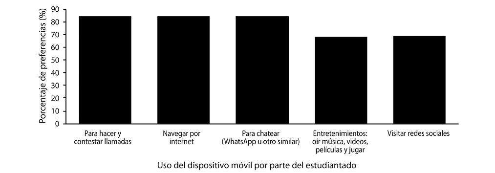 Referente al uso del dispositivo móvil, el 85,15% del estudiantado utilizan su dispositivo para realizar y contestar llamadas telefónicas, seguido con un 84,65% para navegar por Internet, y ese mismo porcentaje para chatear (Fig. 6).