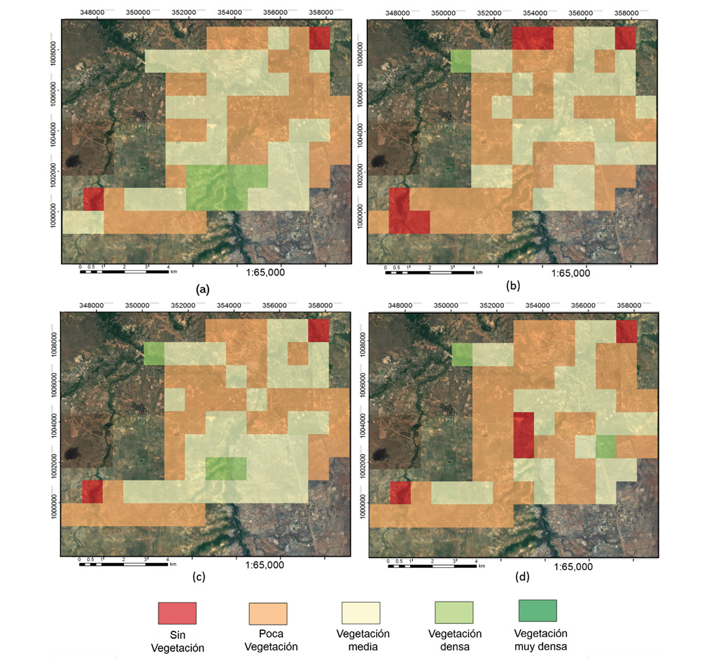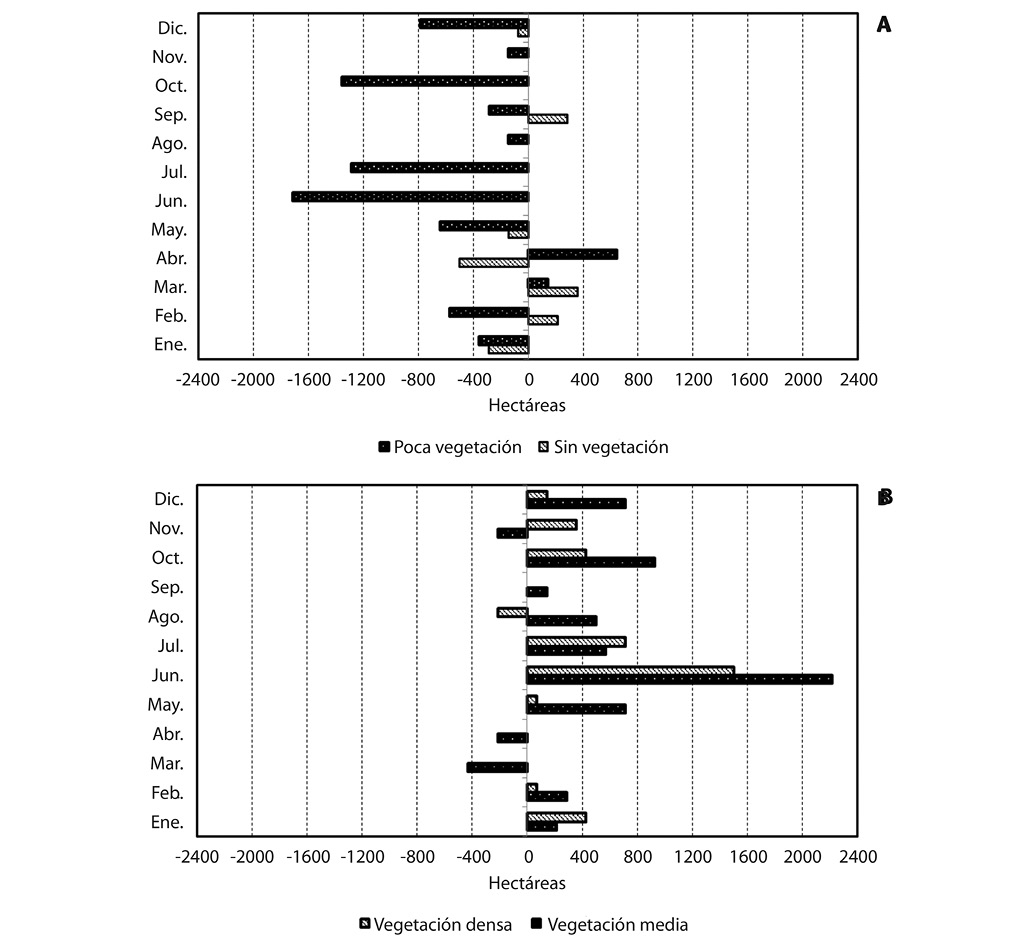 El total de la superficie correspondiente a cada categoría del NDVI se muestra en el cuadro 1; la mayor superficie se concentra entre las categorías de poca a media vegetación con porcentajes que oscilan entre los 18,4% para algunos meses húmedos y un 82,8% para meses secos; esto es consistente si se considera que se trata de una zona de Bosque seco tropical.