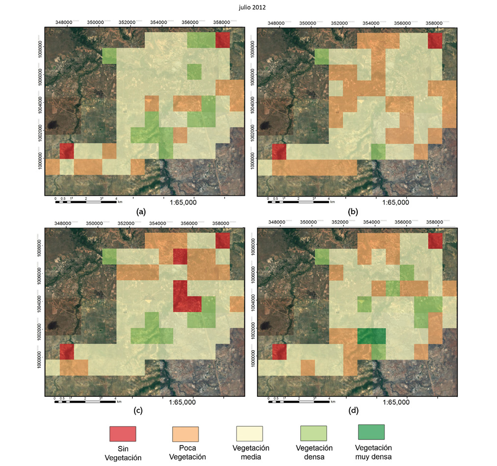 Fig. 3. Distribución espacial de las categorías del NDVI durante los meses lluviosos (julio y septiembre) en la comunidad indígena de Kashaama. (a) julio 2012; (b) julio 2013; (c) septiembre 2012; (d) septiembre 2013.