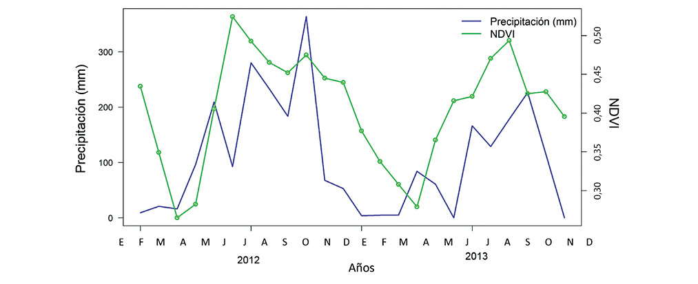 El análisis de regresión entre los valores de precipitación de la zona bajo estudio y los valores del NDVI (R2 corregido=0,2556; p=0,0068; error estándar= 0,0623) indica una relación positiva entre las dos variables. Se observa que el comportamiento de la precipitación se refleja en el comportamiento temporal del NDVI, es decir los valores más bajos de precipitación se relaciona con los valores mínimos de NDVI (Fig. 4).