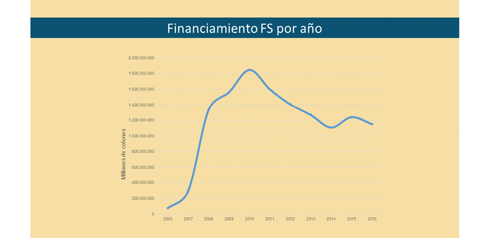 El presupuesto invertido en el Fondo del Sistema en el periodo 2006-2016, ha variado entre 200 millones y 1 800 millones de colones, con tendencia histórica hacia una disminución (Apéndice 1).