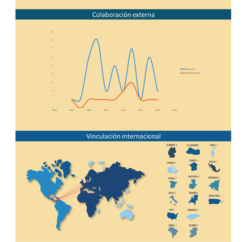 La colaboración con otras instituciones costarricenses ha variado mucho de un año a otro, sin patrón histórico. La colaboración internacional es mínima y se da fundamentalmente con otros países del continente y con Europa Occidental.
