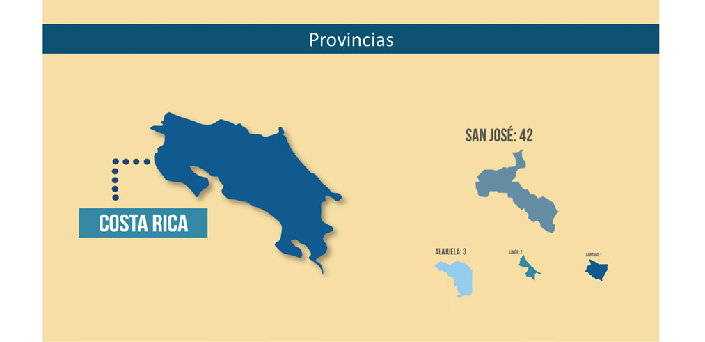 A nivel de provincia, los proyectos han estado centrados administrativamente en la provincia de San José, pero han beneficiado principalmente las zonas costeras (28 proyectos) y las zonas fronterizas (20 proyectos); 32 fueron en la Gran Área Metropolitana.