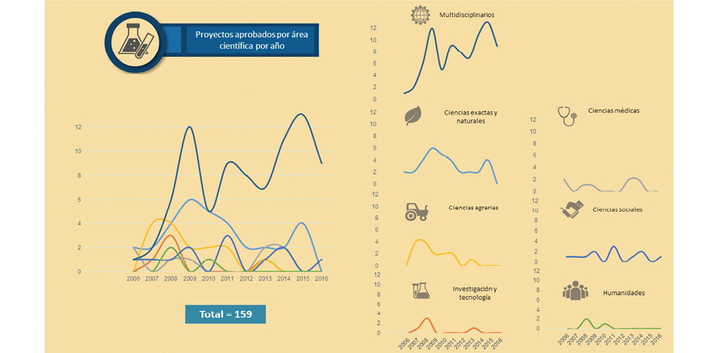 Se han hecho pocos proyectos en humanidades, ciencias sociales, medicina y tecnología. La mayoría han sido en temas agrarios, ciencias exactas y naturales, y con marcado crecimiento en años recientes, estudios multidisciplinarios.