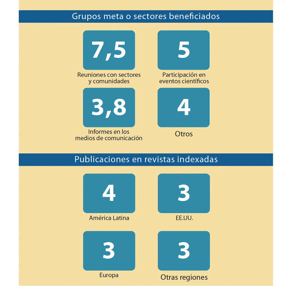 Los resultados transferidos a los grupos meta fueron principalmente reuniones con sectores y comunidades (N=337), cercanamente seguidos de participación en eventos científicos (N=322) y otros productos varios (N=132). La presencia en los medios de comunicación también fue importante, con 137 reportajes y entrevistas (Apéndice 1).