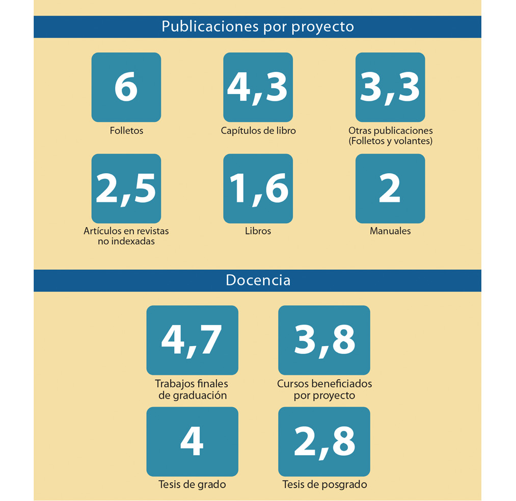 En el área docente, hubo 213 cursos beneficiados con el proyecto, produciéndose 242 trabajos finales de graduación, 201 tesis de grado y 145 tesis de postgrado (Apéndice 1).