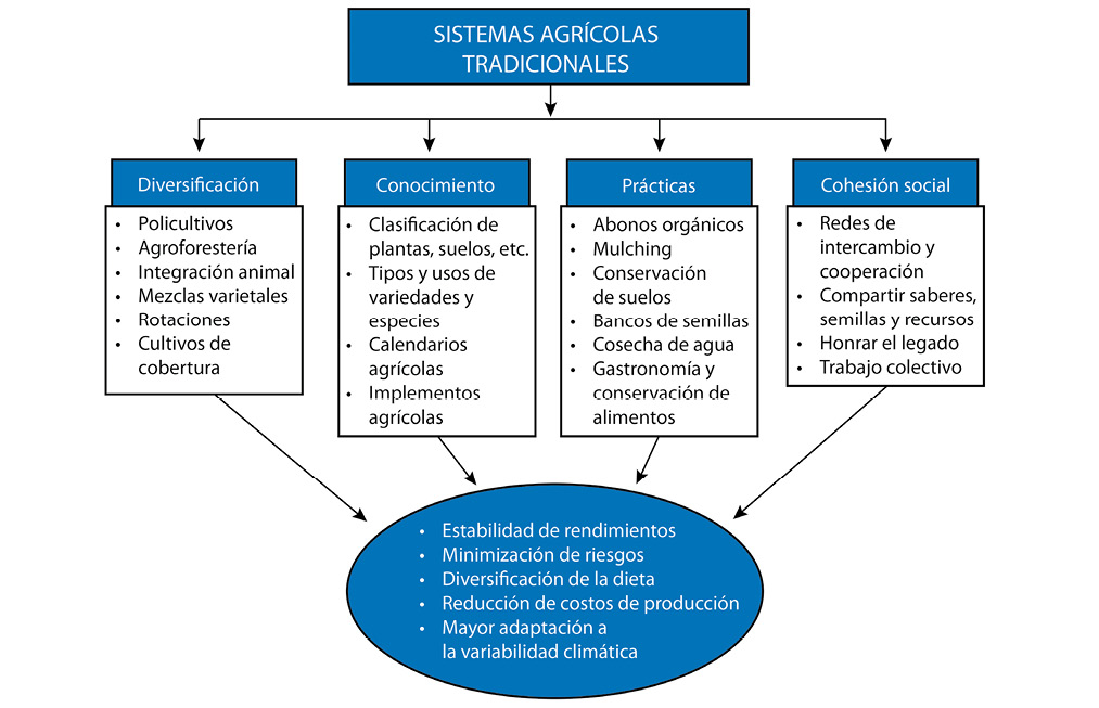 Fig. 1. Características socio-ecológicas de los sistemas agrícolas tradicionales que confieren resiliencia al cambio climático y otros beneficios.