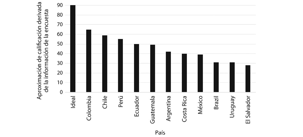 La encuesta, aplicada a 11 países de Latinoamérica (Argentina, Brasil, Chile, Colombia, Costa Rica, Ecuador, El Salvador, Guatemala, México, Perú, Uruguay) se basó en ocho criterios de análisis: medidas de mitigación, adaptación, financiamiento, transferencia de tecnología y creación de capacidades, acceso a la información, convocatoria, consulta y participación, y gobernanza. Como se puede observar en la Fig. 1, el resultado más alto lo obtuvieron Colombia y Chile, los cuales alcanzaron niveles cercanos a las dos terceras partes de la puntuación de 90, considerada como ideal (Guzmán & Castillo, 2016). Estos resultados reflejan, entre otras cosas, que las partes consultadas perciben que las INDC no representaron una visión integrada del país y no tomaron en cuenta las necesidades o propuestas de los sectores más vulnerables de estos, a pesar de contar con un proceso formal de participación, e inclusive estar presente dentro de su marco normativo de mayor jerarquía. Otro ejemplo en esta misma línea es demostrado por el caso costarricense, donde la puntuación alcanzada en este proceso fue menor a la mitad del puntaje máximo, a pesar de que el artículo 9 de su Constitución Política, modificado en el año 2003, hace alusión a que “El Gobierno de la República es popular, representativo, participativo, alternativo y responsable” y su artículo primero, modificado en el año 2015, resalta a esta República como “democrática, libre, independiente, multiétnica y pluricultural”, reconociendo así la diversidad de los actores involucrados.