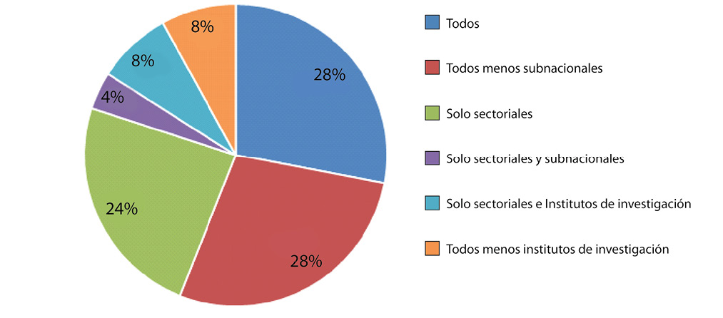 Como se puede ver en los resultados del análisis (Fig. 2), de 24 mecanismos de coordinación interinstitucional para una política climática efectiva en Latinoamérica y el Caribe, la inclusión de la totalidad de distintos actores en el proceso (autoridades sectoriales, gobiernos subnacionales, sector privado, Organizaciones No Gubernamentales (ONG) y universidades/centros de investigación), equivale únicamente al 28% de los casos, es decir siete de veinticuatro países del estudio (Plataforma LEDS LAC et al., 2017).