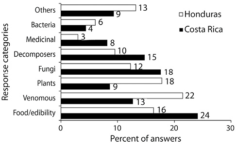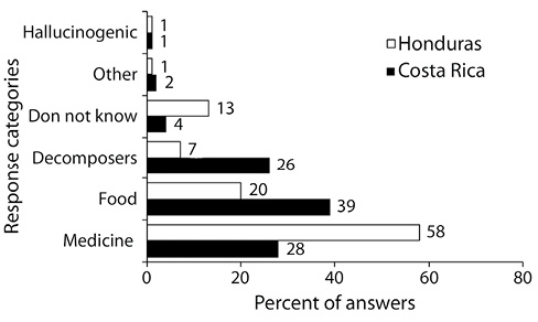 Responses between the groups on the potential uses of fungi were also worthy of note. Costa Rican respondents preferred the food and edibility category; conversely, the hallucinogenic and venomous one was more common in Honduras. As observed before, the latter answer was preferred by females and since these were the most common participants in Honduras, such a result was somehow expected. However, the higher frequency of Costa Rican answering aspects within the decomposition and ecological processes as well as within the category called others, suggested that this group had more informational resources to provide a response to questions on fungi (Riechers et al., 2016).
