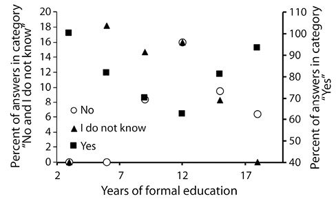 For example, when participants were asked if fungi were important for the planet, an interesting observation was made. Such a question had an element of bias in the grammatical construction itself, but it was useful to evaluate behavioral patterns among surveyed groups. In this case, the mutually exclusive pattern of responses suggested that respondents took the dichotomy approach, which may indicate behavioral conductivism in the populations studied. It seemed that for participants, answers such as yes or no carried a different value than answering I do not know or providing no answer. Even though this was not surprising from a behavioral perspective in Central American populations (Anderson & Montero-Sieburth, 1998), it may provide an indication of the limited role of education in promoting critical thinking around natural resources. At least for the Costa Rican society there are studies showing a high level of self-perceived green mentality that actually represents a double discourse in practice (Courvisanos & Jain, 2006).