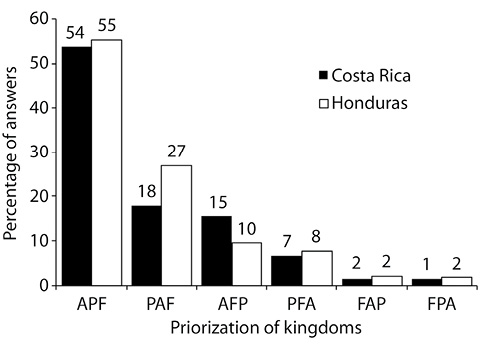 Fig. 3. Priorization of kingdoms by participants across both studied countries. A=animals, P=plants, F=fungi.
