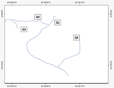 EL drenaje Q1 es una quebrada con origen en el cerro San Miguel, un área boscosa conservada fuera de la finca. Q1 puede contener aportes de nitratos no registrados por lo que se utiliza como control de aleatoriedad. Es el drenaje principal o madre, de caudal mayor a lo largo del año. |