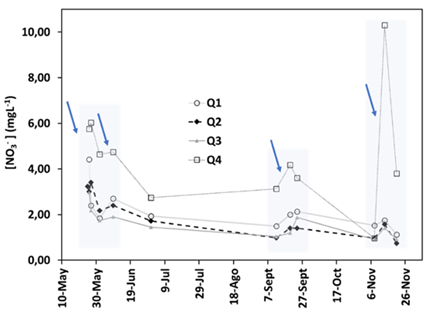 Fig. 2. Concentración de nitratos del drenaje primario Q1 y los drenajes secundarios Q2, Q3 y Q4 La toma de muestras es puntual, sin embargo, se unen los puntos para facilitar la visualización de la tendencia. Las flechas señalan días de fertilización de la finca.