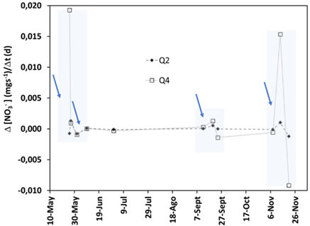 Fig. 4. Cambio de la carga de nitratos con respecto al tiempo de muestro de los drenajes secundarios, Q2 (ubicado en suelo clase textural franco arenosa) y Q4 (suelo clase textural arcillosa) de la carga de nitratos con respecto a los resultados del análisis anterior (primera derivada del monitoreo de la carga de nitratos).