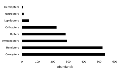 Del total de insectos recolectados, Coleoptera registró la mayor abundancia con 538 individuos, que representa el 27,98%, seguido por Hemiptera con 522 individuos (27,15%) e Hymenoptera con 292 (15,18%). Neuroptera con 11 individuos (0,57%) y Dermaptera con nueve (0,47%) obtuvieron la menor abundancia de insectos (Fig. 1).