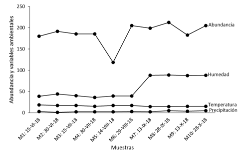 Las variables ambientales como la temperatura, humedad y precipitación, influyen directa o de manera indirecta en la fluctuación, distribución y establecimiento de los insectos (Wolda & Fisk, 1981; Dajoz, 2001). Estos datos muestran que la abundancia aumenta cuando se presenta mayor precipitación, elevada humedad y menor temperatura. Se conoce que las precipitaciones altas promueven la producción de hojas tiernas y suculentas en las plantas de las que se alimentan los insectos tropicales (Wolda, 1977; 1978).