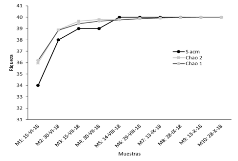 Se evaluó con el programa EstimateS 9, la eficiencia del muestreo mediante curvas de acumulación de especies, donde se aleatorizó 1 000 veces la posición de cada unidad de esfuerzo muestreal con los estimadores no paramétricos de Chao 1 y Chao 2 (Moreno, 2001; Colwell, 2013). Esta fue juzgada gráficamente en términos de su comportamiento asintótico (Colwell, 2013). Estos estimadores requieren datos de presencia o ausencia, tienen más exactitud y menos sesgo cuando se trabaja con pequeñas muestras (Hortal, Borges, & Gaspar, 2006; Willie, Petre, Tagg, & Lens, 2012).