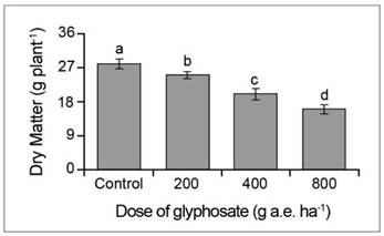 Algarrobo negro growth was significantly inhibited by all the doses of glyphosate. At the end of the assay, the seedlings treated with doses of 200, 400 and 800 g a.e. ha-1 glyphosate had an aerial biomass 23, 53 and 69% lower than the control (Fig. 1).