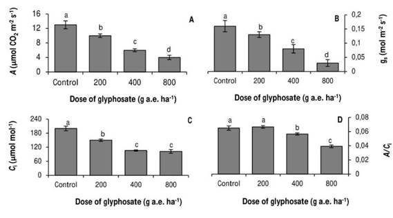 The photosynthetic rate also decreased as the doses tested increased (Fig. 2A). With the dose of 800 g a.e. ha-1 glyphosate, net photosynthesis was 69% lower than in the untreated control. A similar trend was observed in the stomatal conductance (Fig. 2B).