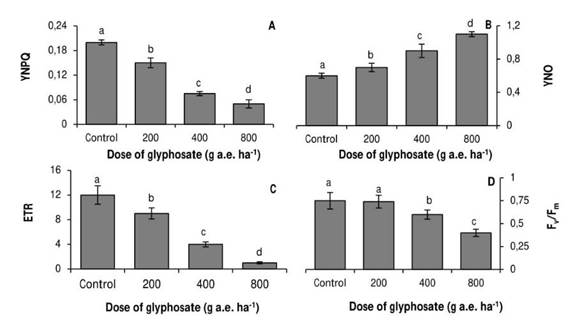 The decrease in YNPQ was accompanied by an increase in YNO (Fig. 3B), which was not sufficient to mitigate the negative effects of the herbicide, expressed in the decrease in the electron transport rate (Fig. 3C). This variable manifested a strong reduction, mainly in the doses of 400 and 800g a.e ha-1 glyphosate, which shows an alteration in the photochemical stage of photosynthesis.