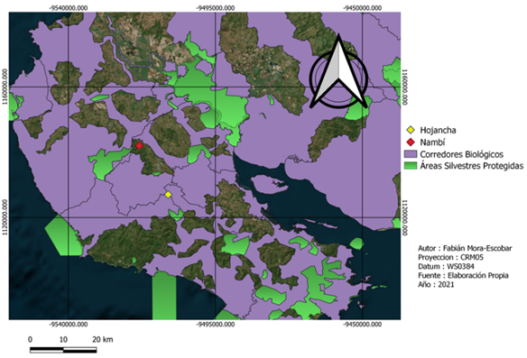 La recolección de datos de campo se realizó en dos fincas con características del paisaje distintas (Fig. 1). Nambí presenta cuerpos de agua dentro del área de muestreo y se ubica a 2.7 km con respecto al Parque Nacional Diría, siendo esta el área protegida más cercana, así mismo el área de muestreo no presenta ninguna categoría de protección (Fig. 2). Con respecto a Hojancha, no se tienen ríos cercanos al área de muestreo, el área protegida más cercana es la Zona Protectora Montealto que se ubica a 4,3 km de distancia y es parte del Programa Nacional de Corredores Biológicos (Fig. 3). Entre el área de muestreo y dicha zona protectora, se tiene un área mayormente urbanizada.
