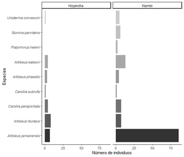 Fig. 4. Número de individuos de especies de murciélagos frugívoros (Phyllostomidae) capturados en dos localidades en la Península de Nicoya, Guanacaste, Costa Rica.