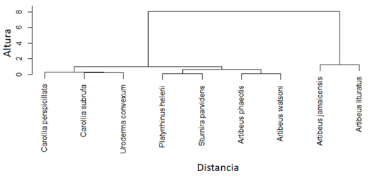 Fig. 5. Dendrograma resultante del análisis de agrupamiento jerárquico de especies de murciélagos frugívoros (Phyllostomidae) basado en dos rasgos funcionales (masa corporal y longitud del antebrazo) en dos localidades en la Península de Nicoya, Costa Rica.