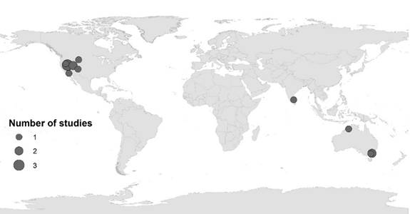 Fig. 1. Global distribution of studies evaluating the impact of feral horses on populations of wild