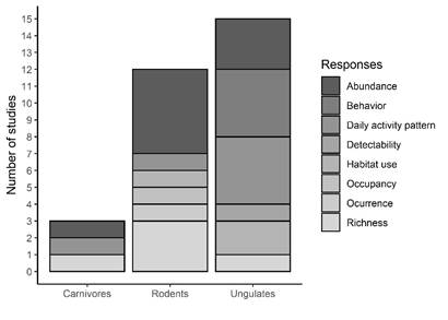 The 14 articles evaluated showed most studies were correlational (n = 72%), followed by the natural experiment (n = 21%) and controlled experiments (n = 7%) (Appendix 2). Responses evaluated were highly variable between taxonomic groups. The assessed response variable most used was abundance (n = 9), followed activity patterns (n = 6), species richness (n = 5), behavior (n = 4), habitat use (n = 3), detectability (n = 1), occupation (n = 1) and occurrence (n = 1) (Fig. 2.).