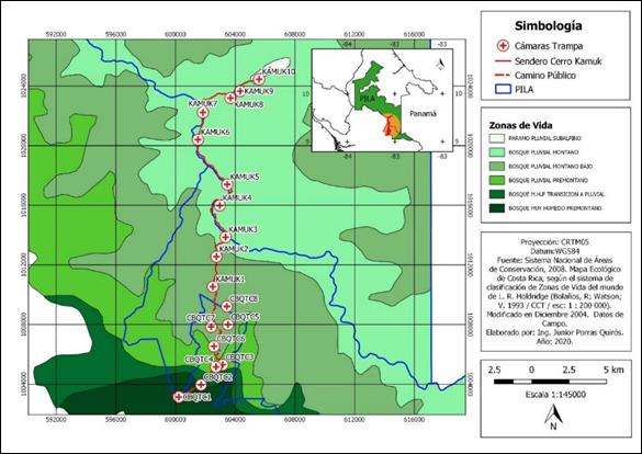 Diseño de muestreo: Para reflejar los ecosistemas del PILA y el CBQTC, combinamos el muestreo sistemático y selectivo (Hurtado & Soto, 2017). Cada estación de fototrampeo se instaló considerando que entre ellas existiera una distancia mínima de 2 km (Rovero & Marshall, 2009; Parsons et al., 2017) y que hubiera al menos dos estaciones por zona de vida, así como rastros de mamíferos silvestres (Karanth et al., 2006) y árboles grandes en donde colocar las cámaras trampa. Utilizamos el programa Quantum Giz 2,8 (QGIS, 2020) y el Atlas Digital de C.R. (Ortiz, 2014) para trazar una cuadrícula de 1x1km sobre el sitio de estudio. Instalamos estaciones de fototrampeo en el borde de senderos, caminos, servidumbres y carriles. Tramitamos el permiso de investigación R-SINAC-PNI-ACLAP-016-2021 y en el CBQTC obtuvimos la autorización de los propietarios. Las estaciones de fototrampeo permanecieron en un mismo sitio el cual georreferenciamos mediante un GPS Garmin 64s (Apéndice digital, Tabla 1). Prolongamos el tiempo de muestreo durante las 24 horas desde el 12 de julio del 2018 al 18 de abril del 2021 (1 012 días), lo cual brindó un esfuerzo de muestreo de 15 335 días cámaras trampa, pues el tiempo necesario para investigar mediante fototrampeo es inversamente proporcional al número de cámaras instaladas (Hurtado et al., 2018).