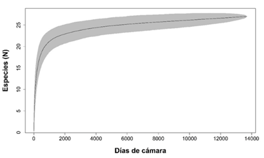 Riqueza y estado de conservación: Con un esfuerzo de muestreo de 15 335 días cámara trampa proveniente de 18 estaciones de fototrampeo, obtuvimos 36 667 registros en los que detectamos 27 especies silvestres de mamíferos medianos y grandes, de las cuales 25 las registramos en el CBQTC y 24 en el PILA. El orden mejor representado fue Carnívora, con cinco familias y 12 especies, seguido por Rodentia con cuatro familias y cinco especies. Detectamos ocho especies carnívoras, siete herbívoras, siete omnívoras, tres frugívoras y dos insectívoras, de las cuales, la mayor abundancia relativa la detectamos en Sciurus granatensis, Tapirus bairdii, Sylvilagus dicei y Mazama temama (herbívoras) y Cuniculus paca (frugívora). De acuerdo con la lista roja de la UICN, registramos dos especies en peligro, cuatro vulnerables, dos casi amenazadas, 18 con preocupación menor y una con datos insuficientes. Ocho especies están en el Apéndice I y II en el Apéndice II de CITES. Nueve especies están en peligro de extinción y cinco tienen poblaciones reducidas según la lista del MINAE (Apéndice digital, Tabla 2). En los primeros 19 días de muestreo detectamos trece especies y requerimos 991 días más para detectar las demás (Apéndice digital, Tabla 3). A través del programa R (R Core Team, 2019), generamos la curva de acumulación de especies (Fig. 2), la cual tiende a ajustarse a la asíntota. La zona de color gris representa un intervalo de confianza del 95%.