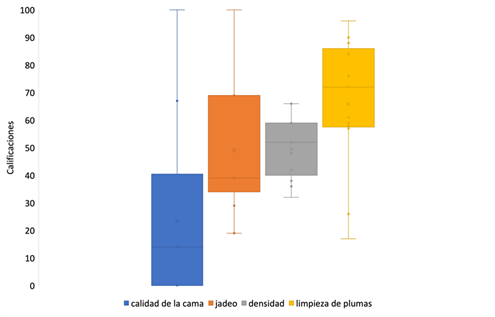 De acuerdo con los resultados, las 22 granjas evaluadas presentaron condiciones que propiciaron el bienestar de los pollos. El 54% de las granjas obtuvo calificación de excelente y tuvieron calificaciones mayores a 55 en todos los principios evaluados y más de 80 en dos de los principios. El 46% de las granjas obtuvo calificación de buena, con puntaje mayor a 20 en los cuatro principios evaluados y más de 55 puntos en dos de los principios. Ninguna granja fue considerada como aceptable o inaceptable. La mayor parte de las granjas alcanzaron calificaciones promedio superiores o cercanas a 55 en cada uno de los principios evaluados (Tabla 1). La puntuación promedio más baja se obtuvo en el principio de buena salud con 48 puntos, calificación asociada con la presencia de cojeras y lesiones por pododermatitis. El promedio más bajo, por prueba se obtuvo en las pruebas de cojeras (18,31), calidad de la cama (23,38), pododermatitis (27,54) y en la PCC (18). Las pruebas con mejores calificaciones fueron la PDE (93,54), ausencia de lesiones en planta de proceso (88,74) y ausencia de hambre (80,82). Las pruebas que mostraron mayor variabilidad en las calificaciones fueron las de calidad de la cama, cojeras y jadeo.