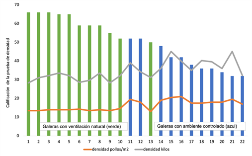 Análisis de los datos. Para el análisis de los datos obtenidos en cada una de las pruebas se utilizó el instrumento denominado Spline funtions Welfare Quality® proporcionado por el protocolo, en el programa excell, versión 16,51 (21071101). Para el análisis de las calificaciones se realizó estadística descriptiva. Para determinar las diferencias entre galeras con ventilación natural y galeras con ambiente controlado se utilizó la prueba no paramétrica de Kruskal Wallis.