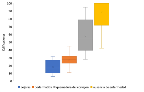 El principio de buena salud se vio afectado por las calificaciones obtenidas en las pruebas de porcentaje de cojeras (18,31) y de pododermatitis (27,54). Calificaciones similares (19 y 26 puntos respectivamente), fueron reportadas en granjas evaluadas en Brasil (Federici et al., 2016). Knowles et al. (2008) encontraron alta prevalencia de cojeras y porcentajes mayores al 20% para lesiones leves y porcentajes similares para lesiones severas. Sans et al. (2014) obtuvieron una calificación promedio de 80 en el porcentaje de cojeras en granjas de pollos de engorde con acceso al exterior y se atribuyó al ejercicio (Sans et al., 2014), el cual mejoró las condiciones esqueléticas de los pollos.