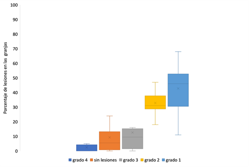 Principio de buena salud: En este criterio se evaluó la presencia de cojeras, de pododermatitis y de quemaduras del corvejón de los pollos en las granjas en la prueba denominada ausencia de lesiones en granja. La prueba de cojeras: se modificó y se realizó en transectos (Fig. 2), de acuerdo con el método propuesto por Bensassi et al. (2019); Marchewka et al. (2013). Se evaluó el grado de cojera en 5 calificaciones. Se calculó un índice de cojeras de acuerdo con el porcentaje de lesiones moderadas y al porcentaje de lesiones severas. Quemaduras del corvejón y de pododermatitis: Se hicieron 10 trampas de 10 aves para cada una para evaluar en forma individual la pata derecha de cada pollo (Fig. 3), se clasificó el grado de lesión de pododermatitis y el grado de lesión de quemaduras del corvejón, de acuerdo con la clasificación de Butterworth (2015). Ausencia de enfermedad: Para evaluar este criterio se utilizaron los datos obtenidos de las lesiones encontradas en la planta de proceso y el porcentaje de mortalidad en la granja. Porcentaje de mortalidad en la granja: Se calculó con la cantidad de animales que murieron por causas naturales desde el ingreso a la granja hasta la fecha de la visita. Porcentaje de descarte en la granja: Se calculó con la cantidad de pollos que se eliminaron desde el ingreso a la granja hasta la fecha de la visita. Lesiones en la planta de proceso: Para evaluar las lesiones en la planta de proceso, se contó la cantidad de pollos separados en cajas plásticas por los inspectores de calidad de la planta para cada tipo de lesión: cantidad de pollos decomisados por septicemia, ascitis, abscesos subcutáneos, sinovitis, traumas, hepatitis y el porcentaje de pollos emaciados o caquéxicos. Debido a la alta velocidad de la línea de procesamiento, no se evaluaron las lesiones en pechuga, en el cojinete plantar ni el grado de deshidratación. Se evaluó porcentaje de lesiones por sinovitis, esta lesión no se contempla en el protocolo.