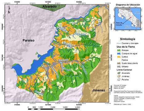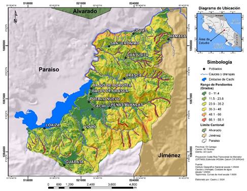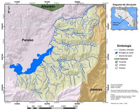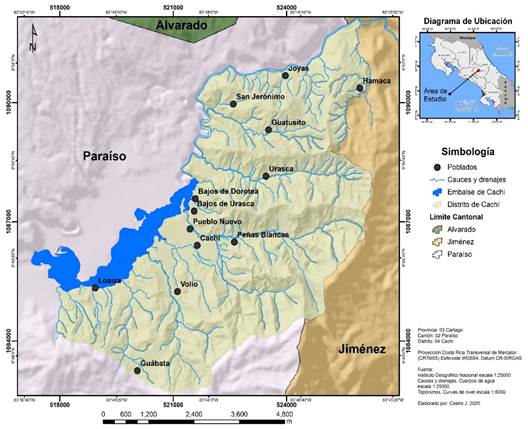 Área de estudio: El distrito de Cachí se encuentra entre las coordenadas 517 500 y 526 500 m este y 1 082 5000 y 1 091 000m norte (Fig. 1.) del sistema de proyección Transversal de Mercator para Costa Rica (CRTM) y tiene un área de 41,24km2. Constituye uno de los distritos del cantón de Paraíso y está conformado por las comunidades de San Jerónimo, Urasca, Peñas Blancas, Cachí, Volio, Loaiza y San Miguel. Alberga el embalse de Cachí el cual es utilizado para la generación hidroeléctrica y en él se desarrollan actividades agropecuarias y turísticas.