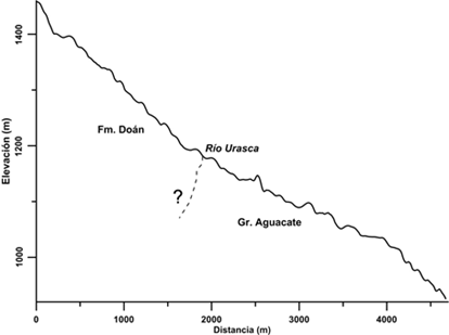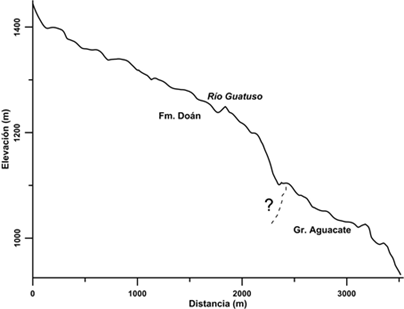 El río Urasca tiene una variación topográfica con un descenso casi rectilíneo del río, desde los 1 400m hacia la formación Doán y continua constante sobre la formación Aguacate (Fig. 3.). Respecto al río Guatuso, el perfil presenta cambios altimétricos (entre 1 400m hasta 1 200m), regulares en el trayecto sobre la Formación Doán, luego se observa un cambio abrupto en el gradiente en el contacto con la Formación Aguacate, entre ambas unidades podría darse la surgencia de agua considerando que la Formación Doán da origen al Acuífero Peñas Blancas. (Fig.4.).