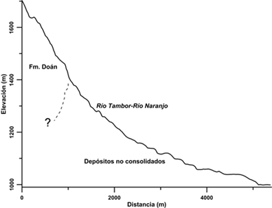 Para el caso del río Naranjo (Fig. 5.), el perfil muestra un descenso fuerte relacionado a una mayor resistencia de los materiales que conforman la Formación Doán desde aproximadamente los 1 700m hasta 1 400m, y a partir de ese punto el descenso del río es más suave donde inician los Depósitos no Consolidados.