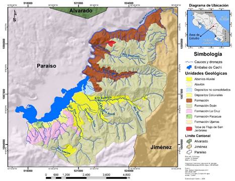 a) Unidad Cachí: conformada por depósitos no consolidados de origen fluvial y lacustre ubicado en las zonas planas, los materiales fluviales son producto de la hidrodinámica de los ríos Oro, Zapote-Irola y Tambor-Naranjo, así como las terrazas formadas por la dinámica del río Reventazón, sin embargo, debido a la carencia de manantiales y pozos no se puede evidenciar esto totalmente.