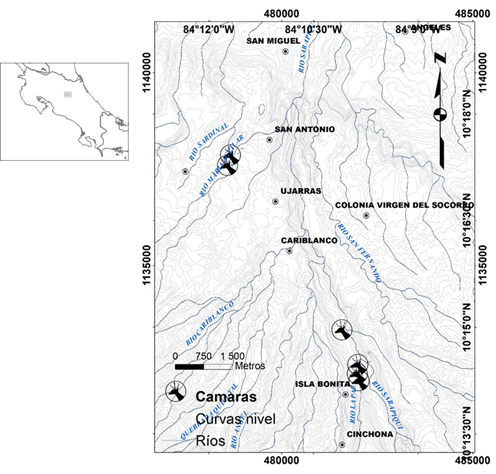 La investigación se desarrolló en la región montañosa entre las localidades de Cinchona, Cariblanco y San Miguel de Alajuela entre los 10°18´00´´ N, 84°12´00´´ W y los 10°13´30´´ N, 84°9´00´´ W en propiedades adquiridas por el Instituto Costarricense de Electricidad de Costa Rica para la construcción de un proyecto hidroeléctrico.