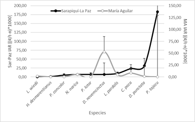 Algunas especies tendieron a aumentar su abundancia relativa en algunos sitios, como el caso del saíno en los sitios de muestreo en la confluencia Sarapiquí y La Paz, mientras que el registro del armadillo o cusuco (D. novemcinctus) fue particularmente alta en el río María Aguilar (Figs. 2 y 3).