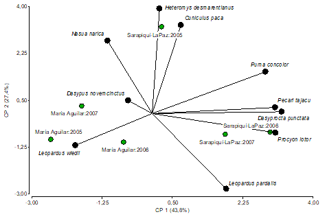Los felinos puma y ocelote se registraron en ambos sitios de muestreo, tanto en La Paz como en María Aguilar, mientras que el tigrillo (L. wiedii) se registró y asoció con los sitios de muestreo en el río María Aguilar (Fig. 3). A partir del análisis de componentes principales se sugiere que la confluencia de los ríos Sarapiquí y La Paz registraron mayor cantidad de especies de mamíferos silvestres durante la investigación.