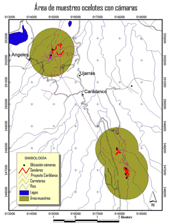 Entre abril 2005 a junio 2007 se establecieron seis sitios geográficos de muestreo, dos sitios de muestreo en el río María Aguilar afluente del río Sarapiquí, y cuatro en la confluencia del río Sarapiquí con el río La Paz. Se definieron los sitios al azar colocando dos cámaras individuales no permanentes ni pareadas por sitio, alternándolas entre los sitios geográficos, separadas al menos 300 metros una de otra. Se utilizó película 35mm de ASA 400, con accesorios de camuflaje y sujeción a los árboles por cada cámara (Sanderson, 2004), retirándose la película de las cámaras una vez por semana.