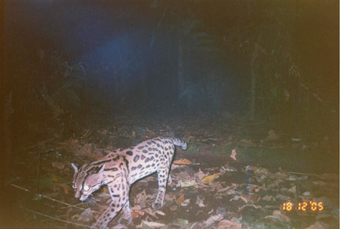 En el caso del ocelote, fue posible reconocer al menos un macho, dos hembras y una cría (Fig. 8), registrándose la presencia de 4 ocelotes en el área de muestreo, lo que sugiere una densidad de 0,43ind/km2; también se fotografió individuos de caucel y de saínos (Figs. 9 y 10).