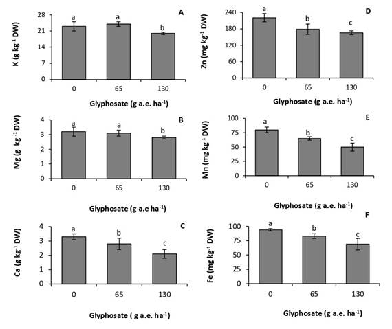 The accumulation of micronutrients was more sensitive to the herbicide than that of macronutrients, decreasing at the two doses tested (Fig. 2D, E, F). The response was proportional to the glyphosate dose. At the dose of 130g a.e. ha-1, concentrations of zinc, manganese, and iron experienced a reduction of 25%, 37,5% and 27%, respectively, with respect to the control.