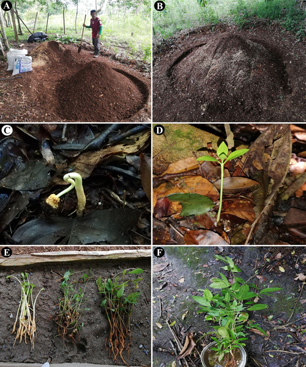 Fig. 1. (A) Preparación de tierra y limpieza de raíces. (B) Mezcla de la tierra con aserrín y granza de arroz. (C) Semilla de Chaunochiton kappleri germinando en el bosque. (D) Plántula de C. kappleri germinada en el bosque sin cotiledones. (E) Plántulas recolectadas listas para guardar en balde con agua para llevar al vivero y embolsarlas. (F) Individuos sumergidos en balde con agua y tierra para evitar la deshidratación.