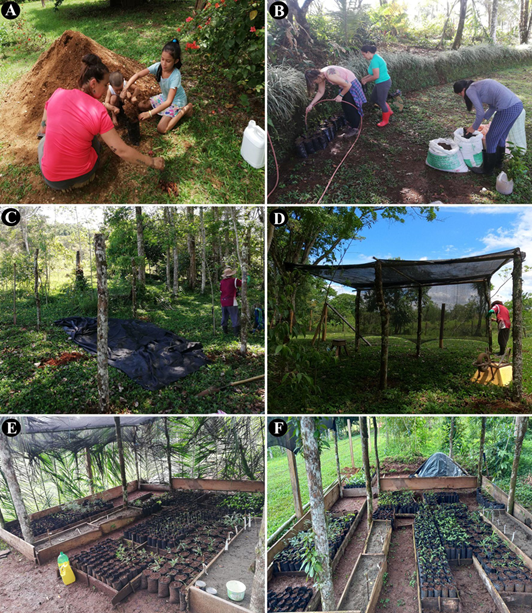 Fig. 2. Plántulas en proceso de ser embolsadas en el vivero de Clavera (A) y en ASOPROLA (B). (C-D) Construcción del vivero “El Chiricano” en la Finca de Don Elio Altamirano en Hamacas, Pittier, Coto Brus. (E) Establecimiento de las bolsas con plántulas en el vivero “El Chiricano”. (F) Vivero “El Chiricano” con 4 meses de establecido.