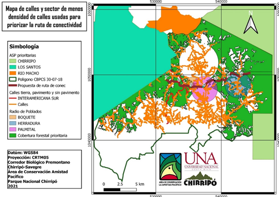 La esencia del presente trabajo radica en como la ruta de conectividad responde a las necesidades de desplazamiento de las especies desde la Reserva Forestal Los Santos hasta el Parque Nacional Chirripó bajo una ruta de conectividad longitudinal que contiene cuatro aspectos importantes a gestionar dentro de la misma; (1) un bosque con mayor cobertura natural que mantiene su cercanía a las áreas silvestres protegidas, (2) disminuye su cobertura conforme se acerca a los sitios de mayor perturbación como lo son las carreteras, densidad de población y áreas cubiertas por pastos en su mayoría. (3) Áreas de protección que pueden conectar parches de bosque que se encuentran desprovistas de vegetación y además incumplen con la legislación ambiental y (4) una ruta de conectividad estructural identificada por medio de sistemas de información geográfica y validación de campo que identifica los sitios prioritarios a reforestar, ruta que es similar a la dinámica que reporta otros estudios (Calvo-Obando, 2009; Gómez-Chavarría, 2014; Chacón, 2016).